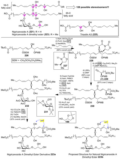 - Chen, J.; Koswatta, P.; DeBergh, J.R.; Fu, P.; Pan, E.; MacMillan, J.B.; Ready, J.M. Structure Elucidation of Nigricanoside A through Enantioselective Total Synthesis. Chem. Sci. 2015, 6, 2932–2937. [Google Scholar] [CrossRef] [PubMed]