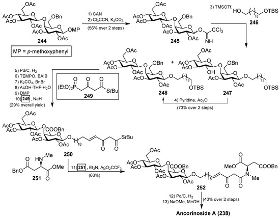 - Petermichl, M.; Schobert, R. Total Synthesis of the Diglycosidic Tetramic Acid Ancorinoside A. Chem. Eur. J. 2017, 23, 14743–14746. [Google Scholar] [CrossRef] [PubMed]