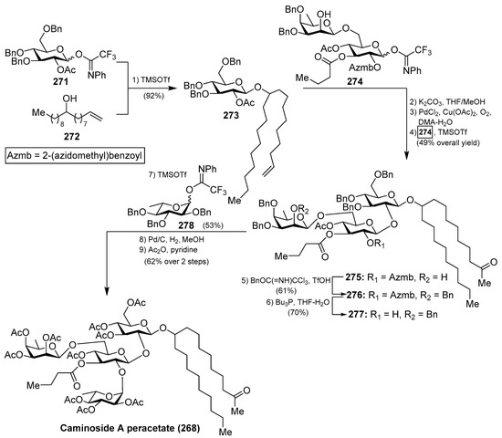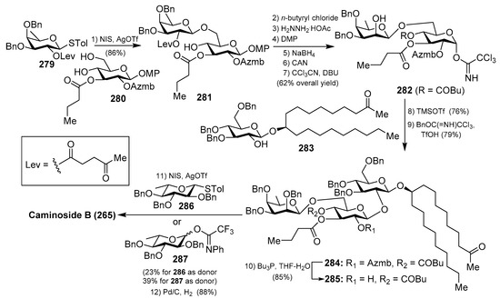 - Sun, J.; Han, X.; Yu, B. First Total Synthesis of Caminoside A, an Antimicrobial Glycolipid from Sponge. Synlett 2005, 3, 437–440. [Google Scholar] [CrossRef]