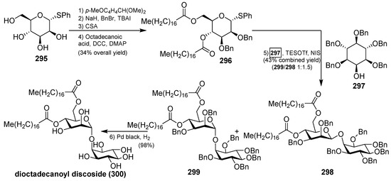 - Florence, G.J.; Aslam, T.; Miller, G.J.; Milne, G.D.S.; Conway, S.J. Synthesis of the Marine Glycolipid Dioctadecanoyl Discoside. Synlett 2009, 19, 3099–3102. [Google Scholar] [CrossRef]