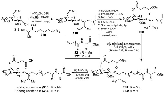 - Reddy, C.R.; Jithender, E.; Prasad, K.R. Total Syntheses of the Proposed Structure for Ieodoglucomides A and B. J. Org. Chem. 2013, 78, 4251–4260. [Google Scholar] [CrossRef] [PubMed]