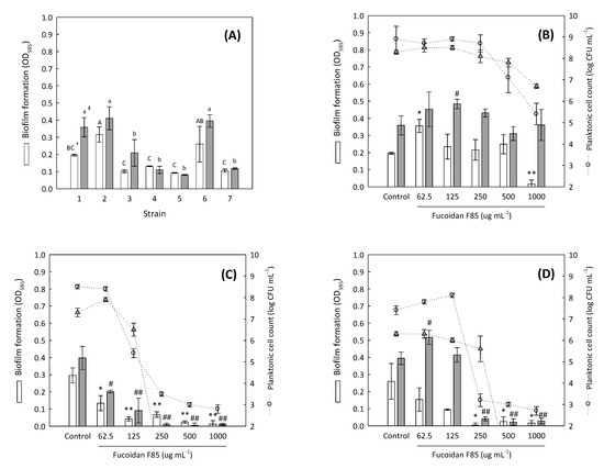Biofilm formation of several dental plaque bacteria in brain heart infusion (BHI) broth for 48 h and the antibiofilm activities of fucoidan F85 against the selected dental plaque bacteria. (A) biofilm formation of several dental plaque bacteria; (B) E. faecalis KCTC 5289; (C) S. mutans KCTC 5458; (D) S. sobrinus KCTC 5809. □, biofilm formation (24 h); ■, biofilm formation (48 h); ○, planktonic cell count (24 h); ▲, planktonic cell count (48 h). 1, E. faecalis KCTC 5289; 2, S. mutans KCTC 5458; 3, S. mutans KCCM 40105; 4, S. oralis KCCM 41567; 5, S. sanguinis KCTC 5643; 6, S. sobrinus KCTC5809; 7, S. sobrinus KCCM 11898. Data expressed as the mean ± SD in triplicate. The initial cell concentration was ca. 5 log CFU mL−1. † The different capital letters indicate significantly different values in 24 h (p < 0.05, ANOVA). ‡ The different small letters indicate significantly different values in 48 h (p < 0.05, ANOVA). * p < 0.05 versus growth control in 24 h (independent t-test), ** p < 0.01 versus growth control in 24 h (independent t-test), # p < 0.05 versus growth control in 48 h (independent t-test), and ## p < 0.01 versus growth control in 48 h (independent t-test).