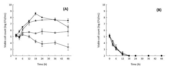 Time-coursed growth inhibitory effect of fucoidan F85 against S. mutans KCTC 5458 in BHI broth and phosphate buffered saline (PBS, pH 7.2) for 48 h. (A) BHI broth; (B) PBS. ●, growth control; Δ, 62.5 µg/mL of fucoidan F85 (MIC/2); □, 125 µg/mL of fucoidan F85 (MIC); ◊, 250 µg/mL of fucoidan F85 (2MIC). Data expressed as the mean ± SD in triplicate. The initial cell concentration was ca. 5 log CFU mL−1.