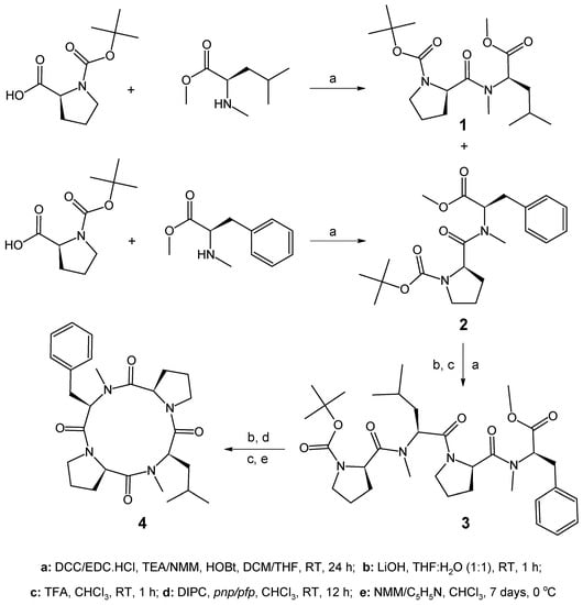 4.3. Procedure for the Synthesis of N-Methylated Tetracyclopeptide (4)