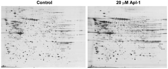 To test the effects of (+)-Apl-1 on RF-24 endothelial cell proteome, the 2D electrophoresis of samples corresponding to the untreated and the 20 µM Apl-1 treated (for 12 h) RF-24 cells was performed. Figure S1 (in Supplementary Material) shows that 12 h of incubation in the presence of 20 μM Apl-1 had no cytotoxic effect on RF-24 cells. Figure 1 shows representative results of 2D electrophoresis highlighting differentially expressed spots.