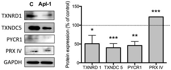 Spots were submitted to MALDI-TOF-TOF/MS for their identification. The identified proteins are involved in signal transduction pathways, glucose and redox metabolism (Table 1 and Table 2). We next confirmed the effects of (+)-Apl-1 on 4 redox proteins (thioredoxin reductase 1, TXNRD1; thioredoxin domain containing 5, TXNDC5; pyrroline-5-carboxylate reductase 1, PYCR1; and peroxiredoxin IV, PRX IV) by Western blotting (Figure 2).