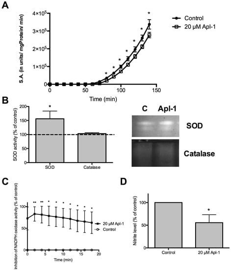 Effects of (+)-Apl-1 on redox enzymatic activity. (A) Protein disulphide isomerase (PDI) kinetics. PDI activity was determined as described in Materials and Methods. (B) Quantification of SOD and catalase activities in zymographies (carried out as described in Materials and Methods), taking control values of untreated cells as 100% and its quantification to control (C) and (+)-Apl-1 samples. Representative images of SOD and catalase zymographies. (C) Inhibition caused by (+)-Apl-1 on NADPH oxidase activity of RF-24 cells. (D) Quantification of nitrite with the Griess reagent as described in Materials and Methods. Data are given as means ± SD of three independent experiments. Significant differences between control-untreated and treated cells: * p < 0.05, ** p < 0.01.