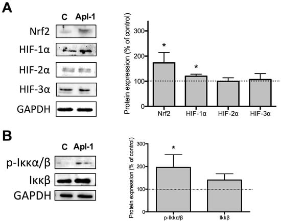 The effects of (+)-Apl-1 on RF-24 endothelial cell transcription factors involved in the control of redox metabolism, such as hypoxia inducible factor 1α (HIF-1α), hypoxia inducible factor 2α (HIF-2α), hypoxia inducible factor 3α (HIF-3α), nuclear factor E2-related factor 2 (Nrf2), and nuclear factor kappa B (NF-κB) were also analyzed. Figure 4A shows the (+)-Apl-1 treatment increased the levels of Nrf2 and HIF-1α proteins in RF-24 cells. On the other hand, activation of NF-κB is controlled by Ikkβ, which avoids its nuclear translocation. However, when Ikkβ is phosphorylated (p-Ikkβ) it releases NF-κB. Figure 4B shows that 20 μM (+)-Apl-1 treatment for 12 h increased the levels of p-Ikkβ in RF-24 cells.