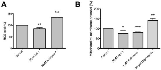 The measurement of the mitochondrial membrane potential (Δψm) is an indirect way to test the mitochondrial functionality and its capacity to regulate both ATP and ROS production [,]. Figure 5B shows that 20 μM (+)-Apl-1 treatment slightly decreased RF-24 cell Δψm in a similar way to the inhibitory effect caused by the complex I inhibitor rotenone.
