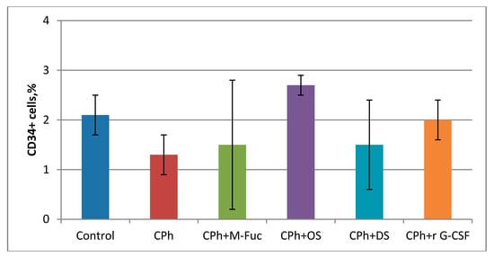 The effect of tested compounds on bone marrow cells was further elucidated. After CPh treatment, a decrease in the number of progenitor cells CD34+ was observed (Figure 2). Injection of M-Fuc or DS in therapeutic mode did not result in a significant recovery of cells, while administration of r G-CSF and OS led to a sufficient increase in the cell concentration. Notably, the effect was more pronounced in the latter case.