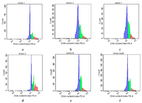 Analysis of the bone marrow cells cycle in mice with CPh-induced immunosuppression after treatment by tested compounds: (a) positive control—intact mice; (b) negative control—CPh; (c) CPh + M-Fuc; (d) CPh + OS; (e) CPh + DS; (f) CPh + r G-CSF.