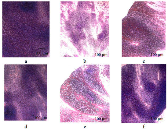 Morphology of the spleen of mice with CPh-induced immunosuppression after treatment with tested compounds (hematoxylin-eosin staining): (a) positive control—intact mice; (b) negative control—CPh; (c) CPh + M-Fuc; (d) CPh + OS; (e) CPh + DS; (f) CPh + r G-CSF. Original magnification ×400.