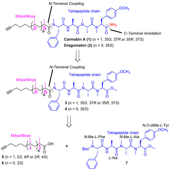 Scheme 1 illustrates our retrosynthetic analysis. The C-terminal amide of carmabin A and dragomabin could be prepared via amidation of the C-terminal methyl esters of compounds 3 and 4. Compounds 3 and 4 were further disconnected into two parts: the Mdya/Moya fragment and protected tetrapeptide 7. Tetrapeptide 7 could be prepared by repeated condensation reactions of amino acids. The methyl group of Mdya/Moya 5/6 could be stereoselectively installed following the methodology developed by Evans [17,18,19].