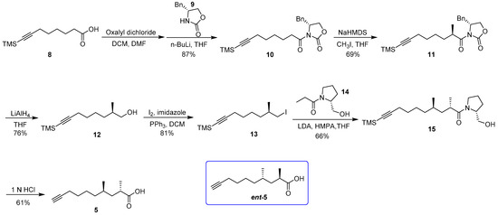 (2S,4R)-2,4-Dimethyldec-9-ynoic acid (5) was obtained following the procedure for the preparation of compound (2R,4S)-2,4-dimethyldec-9-ynoic acid(ent-5) [14].