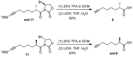 Next, we turned our attention to dragomabin. The Moya 6 fragment of dragomabin was obtained from ent-11 via deprotection of TMS with TFA followed by removal of the chiral auxiliary (Scheme 5).