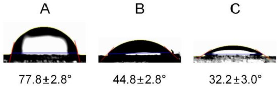 Figure 2. Water contact angle images of (A) non-treated, (B) pDA-coated, and (C) pDA/PLL-coated surfaces.