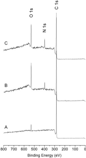 Figure 3. X-ray photoelectron spectra of (A) non-treated, (B) pDA-coated, (C) pDA/PLL-coated surfaces.