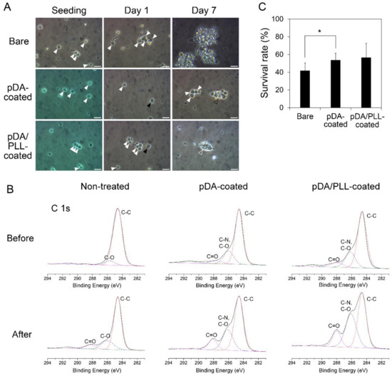 Figure 4. Effects of pDA or pDA/PLL coatings on adherence and survival of the enriched Oryzias latipes ovarian germline stem cells (OGSCs) in culture. (A) OGSC adherence in culture depending on different substrate conditions. After seeding, numerous OGSCs were observed in all groups (white arrowheads) and after 1 day, a few OGSCs adhered on pDA- and pDA/PLL-coated dishes (black arrowheads), while none of OGSCs adhered on non-treated dishes. On day 7, loosely (black hollow arrowhead) and tightly packed (white hollow arrowhead) OGSC colonies were observed in pDA- and pDA/PLL-coated dishes, respectively, whereas only the floating cells and cell aggregates were observed in non-treated dishes. Scale bar = 20 µm. (B) High resolution X-ray photoelectron spectra (C 1s) of non-treated, pDA-coated, and pDA/PLL-coated surfaces before and after incubation in cell culture media. (C) Survival rates of the cell populations containing the enriched OGSCs in culture depended on different substrate conditions. The cell survival rate increased significantly when the cells were cultured on pDA-coated dishes rather than when cultured on non-treated dishes. An asterisk (*) indicates a significant difference, p < 0.05.
