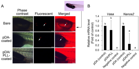 Figure 5. Effects of pDA or pDA/PLL coating on gonadal colonization and relative mRNA expression of vasa and nanos2 genes of ovarian germline stem cells (OGSCs) after culture. (A) Gonadal colonization of OGSCs cultured on pDA- and pDA/PLL-coated dishes. The OGSCs cultured for 10 days on pDA- and pDA/PLL-coated dishes were labeled with fluorescent dye (PKH26) and intraperitoneally transplanted into 11 days-post-fertilization (dpf) larvae. After 9 days, gonadal colonization of the transplanted OGSCs was observed in the larvae transplanted with the OGSCs cultured on non-treated and pDA-coated dishes. In contrast, no colonization was observed in larvae transplanted with the OGSCs cultured on pDA/PLL-coated dishes. Arrows indicate the OGSCs colonized. Scale bar = 100 μm. (B) Relative mRNA expression of vasa and nanos2 genes between the enriched OGSCs cultured on pDA and pDA/PLL-coated dishes. The enriched OGSCs were cultured on pDA- or pDA/PLL-coated dishes and then the cells were subjected to quantitative reverse transcription polymerase chain reaction (qRT-PCR) analysis. A significant decrease of nanos2 expression was observed in the cells cultured on pDA/PLL-coated dishes compared to the cells cultured on pDA-coated dishes, whereas no significant difference was detected in vasa expression between two cell populations. ab Different letters indicate significant difference, p < 0.05. An Oryzias latipes embryonic cell line was used as a negative control.
