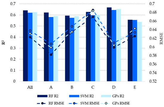 Variation of the ML algorithm could not achieve any consistent improvement of the results obtained with RF for all molecules in the training and test sets taking into account the R2 and RMSE values, Table 6 and Figure 1. For all ML models, the best predictions obtained for the structural clusters are obtained from cluster A—indole derivative centroid—and are also better than those obtained for all training and test set taking into account the RMSE value. Interestingly, the worse predictions obtained taking into account the RMSE value for all the clusters in the training and test set were to the cluster C—2-oxazolidone derivative centroid.