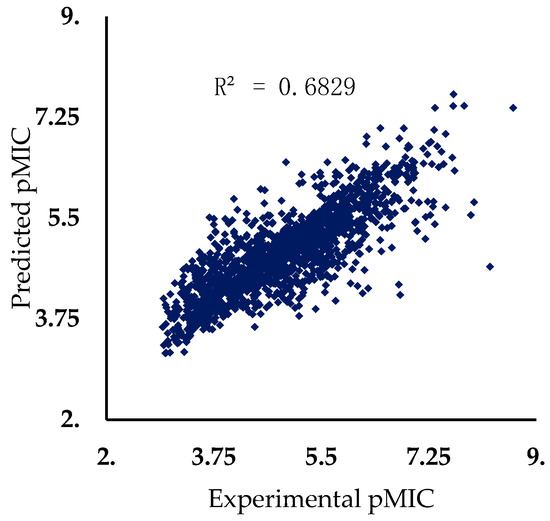 Predicted versus experimental pMIC against MRSA for the 1533 molecular structures of the test set.
