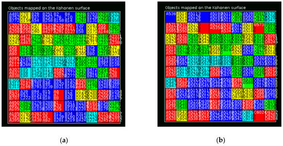 Mapping of the trained and predicted structural clusters of the active and inactive molecules against MRSA on self-organizing map (SOM) for the: (a) Training set; (b) Test set. Red—cluster A, dark blue—cluster B, green—cluster C, light yellow—cluster D, light blue—cluster E.