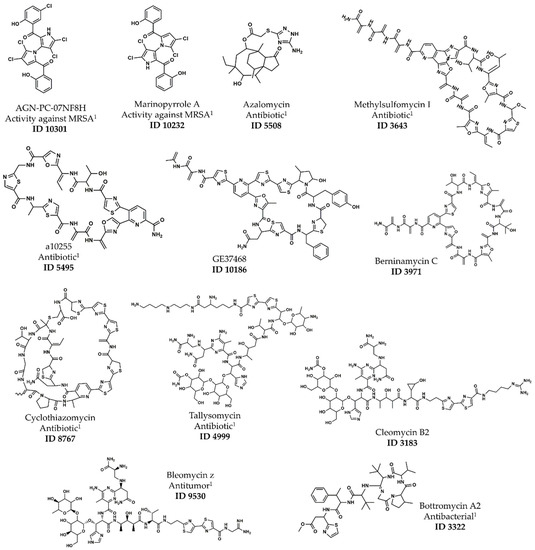 Although the vast majority of currently marketed antibiotics have been isolated from terrestrial microbes, accounting for more than 75% of all antibiotics discovered [26,27], the antibacterial compounds isolated from marine sources have not yet been developed into clinical trials [28,29,30]. However, several novel bioactive compounds with antibacterial activity against MRSA isolated from marine bacteria and fungi were reported [10,30]—(1) isolated from marine-derived bacteria: marinopyrrole A [31], an alkaloid endowed (Streptomyces sp.), and abyssomicin C [32], a spirotetronate poliketide (Verrucosispora sp.); (2) isolated from marine-derived fungus: spiromastixones A–O [33], depsidone analogs (Spiromastix sp.). The marine environment has been proposed as an untapped source of new bioactive molecules, and marine bacteria and fungi seem to be the most important sources for antibacterial compound discovery [29,30,34,35,36]. Computational methodologies such as those using in dereplication and CADD are crucial in the systematic exploration of the biological activity of marine natural products (MNPs) to improve the rate of drug discovery from marine sources [7].