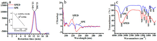 HPGPC chromatogram (a), CD spectrum (b), and FTIR spectrum (c) of SPE and SPED (color artwork).