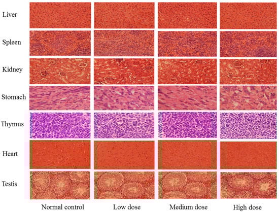 To further evaluate the safety of SPED, a sub-acute toxicity experiment was carried out. During the four-week experiment, no dead mice were observed in all groups. The histopathological result confirmed that SPED could not lead to tissue lesions of the liver, spleen, kidney, stomach, thymus, heart, and testis (Figure 2). Results suggested that SPED had no damaging effects on the bodies of normal mice. The coordinated ligand plays a significant role in toxicity evaluation of different kinds of chromium complexes [22]. Chromium complexes with certain ligands might result in some toxicity. As the most widely applied chromium complex, chromium picolinate had been proved to generate hydroxyl radicals and oxidative DNA damage [23,24]. Moreover, the toxicity of chromium picolinate was closely related to the imine ligands of picolinic acid. Alternatively, the ligand of the SPED is a kind of active polysaccharide, so it could be a safe candidate for a chromium supplement.