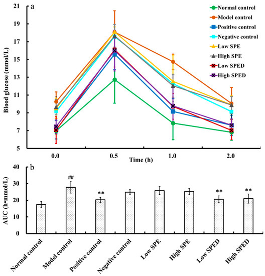 The blood glucose content of all groups is shown in Figure 3a. The fasting blood glucose (FBG) content of the model control group (10.75 mmol/L) increased significantly (p < 0.01) compared to that of the normal control group (6.97 mmol/L). This result showed that the diabetic model was established successfully. The oral supplementation of glucose led to gradual increase of the blood glucose content within 0.5 h. The blood glucose contents of the positive control, low SPED, and high SPED groups decreased to normal levels after 2 h. In addition, the calculated area under the curve (AUC) value of all groups is shown in Figure 3b. The oral glucose tolerance is negatively related to AUC. The AUC value of the model control group was significantly higher (p < 0.01) than that of the normal control group, which indicated that the oral glucose tolerance of the model control group was impaired. It is generally accepted that insulin resistance is closely related to the disorder of glucose metabolism, and long-term hyperglycemia usually triggers microvascular disease [25]. Compared with that of the model control group, AUC values of the two dose groups of the SPED decreased significantly (p < 0.01), which suggested that oral glucose tolerance was ameliorated. Wang et al. (2017) reported that Inonotus obliquus polysaccharides-chromium (III) complex (900 mg/kg) improved the oral glucose tolerance of type 2 diabetes mellitus mice, using the method of intragastric administration [13]. In the oral glucose tolerance test, the dose-dependent relationship was not observed between the low SPED group and the high SPED group. This suggested that supplementation with SPED (5 mg/kg) could effectively improve the glucose tolerance capacity of diabetic mice.