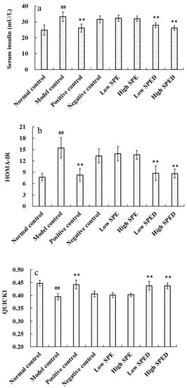Effects of SPED on the serum insulin (a), HOMA-IR (b), and QUICKI (c) of the mice. # p < 0.05, ## p < 0.01 compared with normal control. * p < 0.05, ** p < 0.01 compared with model control.