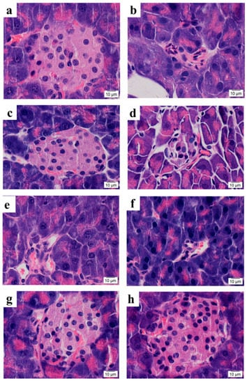 Microstructure of pancreatic islets in mice (H&E stain, 100×) Normal control (a), Model control (b), Positive control (c), Negative control (d), Low SPE (e), High SPE (f), Low SPED (g), High SPED (h) (color artwork).
