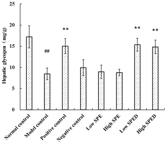 Effects of SPED on hepatic glycogen content of the mice. # p < 0.05, ## p < 0.01 compared with normal control. * p < 0.05, ** p < 0.01 compared with model control.
