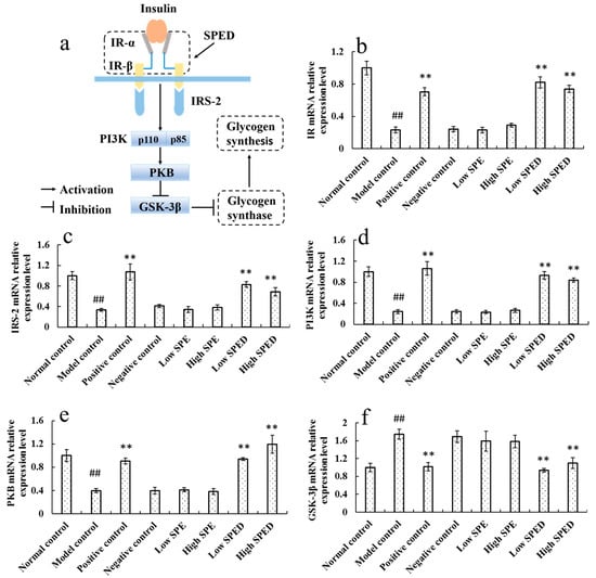 Hepatic glycogen synthesis is a crucial metabolic pathway involved in blood glucose homeostasis and metabolism, which is regulated by insulin. It is generally acknowledged that the PI3K/PKB/GSK-3β signaling pathway is of vital importance in the synthesis of hepatic glycogen [32]. In the PI3K/PKB/GSK-3β signaling pathway (Figure 7a), IR is a tetrameric protein, consisting of two extracellular α subunits and two transmembrane β subunits. Insulin binding to α subunits induces a conformational change in the β subunits, which increases catalytic activity of IR [33]. The activated IR then phosphorylates tyrosine residues of IRS-2. With tyrosine phosphorylation, IRS-2 interacts with the p85 regulatory subunit of PI3K, resulting in the activation of PI3K and PKB in sequence. Moreover, PI3K and PKB are the pivotal protein kinases, which regulate the activity of GSK-3β negatively [34]. As shown in Figure 7b, the IR mRNA expression level in the model control group decreased significantly (p < 0.01), in comparison with that in the normal control group. This result demonstrated that the binding activity of insulin to IR is restricted. Wang et al. (2018) also reported that a high-energy diet decreased the mRNA expression of IR [32]. Owing to the reduced mRNA expression of IR, the IRS-2 (Figure 7c), PI3K (Figure 7d), and PKB (Figure 7e) mRNA expression levels in the model control group decreased significantly (p < 0.01). After the intervention with the SPED, the mRNA expression levels of IR, IRS-2, PI3K, and PKB increased significantly (p < 0.01), while GSK-3β (Figure 7f) mRNA expression level decreased significantly (p < 0.01). Additionally, GSK-3β is a negative regulatory protein, which regulates the activation of glycogen synthase [35]. The reduced mRNA expression of GSK-3β in SPED groups promoted the utilization of blood glucose and hepatic glycogen synthesis. Taken together, our study confirmed that SPED could promote hepatic glycogen synthesis by activating the PI3K/PKB/GSK-3β signaling pathway at the transcriptional level.