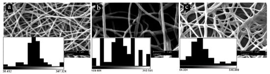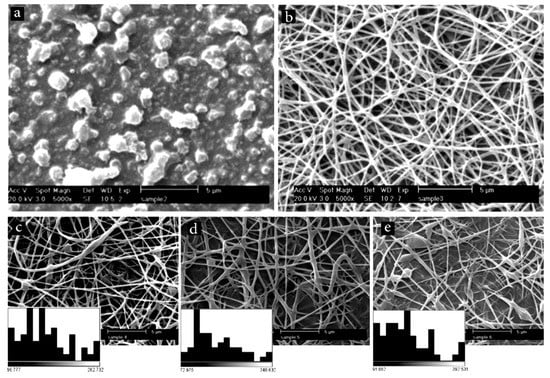 Scanning electron microscope (SEM) images showing the morphology of electrospun polymers: (a) chitosan/polycaprolactone (PCL); (b) chitosan/PCL containing 5% poly(ethylene oxide) (PEO), shows the effect of PEO addition; (c–e) show the effect of keratin concentration (5%, 10%, and 15%, respectively) on the morphology and size distribution of chitosan/PCL nanofibers. The inset histograms in (c,d) show size distribution of the fibers.