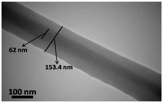 The core-shell structure of the scaffold was further examined by TEM. As Figure 3 shows, the diameters and thicknesses of the core and the shell are 62 nm and 91 nm, respectively. In co-axial electrospinning setup, two dissimilar solutions are delivered by a syringe pump and flow through capillaries. The needle charges with a high voltage and when the electric field is potent enough, a jet of polymer is drawn from the needle and attracted to a grounded collector [21]. As a result, a core-shell structure is attained.