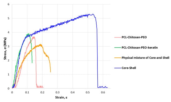The skin on each part of the body has unique mechanical properties matching the function of the respective part [39,40,41,42]. Figure 5 shows typical stress–strain curves of electrospun mats under tensile loading. Measured values of ultimate tensile strength and elongation are reported in Table 1. The energy required to break the samples, as an indicator of toughness, is also presented. In agreement with a previous study [10], the addition of keratin slightly improves the strength at the expense of ductility. This finding can be attributed to a reduction in the motion of polymer chains. Possible intermolecular hydrogen bonding and polar interactions between the components (e.g., between hydroxyl groups of Aloe vera, ester functional groups of PCL, carbonyl groups of keratin, and chitosan amino groups) also affected the strength. Interestingly, the core-shell fibrous structure exhibits better mechanical properties in comparison with their physical mixture. Toughness and elongation were significantly improved (from about 0.5 J/m3 to 2.3 J/m3 and 30% to 63%, respectively) as a result of interactions between hydroxyl, amino, and carbonyl groups of the polymers.