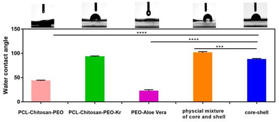 The water contact angle test was employed to evaluate the hydrophilicity of electrospun mats. The results are presented in Figure 6. Keratin reduced the hydrophilicity of the PCL/chitosan mat as this natural fibrous protein has both hydrophilic (Threonine and Serine) and hydrophobic (Phenylalanine, Alanine, Cysteine, Valine, Leucine, Isoleucine, and Tyrosine) chains and its poor wettability is due to the cross-linking of disulfide cystine in the structure [43]. On the other hand, PEO is strongly hydrophilic and almost soluble in water. Therefore, the PEO/Aloe vera mat exhibits a low water contact angle. The core-shell structure exhibits similar hydrophilicity to the shell polymer, while the physical mixture has the highest water contact angle.