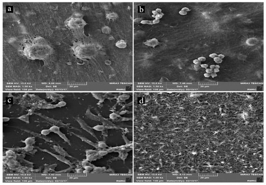 The sterilized specimens were placed in each well of a six-well tissue culture plate. Then, the cells with a density of 25 × 103 cells/cm2 were seeded on the samples and incubated at 37 °C in a humidified atmosphere with 5% CO2 for 4 h. After cell adhesion, a certain amount of culture medium containing 10% FBS was added to each well. The culture medium on specimens was removed after one day and washed with phosphate buffered saline (PBS) for 30 s. The cells were fixed with 3.5% glutaraldehyde and then dehydrated with increasing concentrations of ethanol. Finally, cell adhesion to the specimens was investigated by scanning electron microscopy (FESEM, MIRA3TESCAN-XM, Brno, Czech Republic)