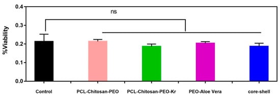 Cell viability of different fibrous mats as assessed by dimethyl-thiazole diphenyl tetrazolium bromide (MTT) after 72 h incubation. Error bars indicate standard error of the means (n = 3). ns is defined as a non-significant difference.