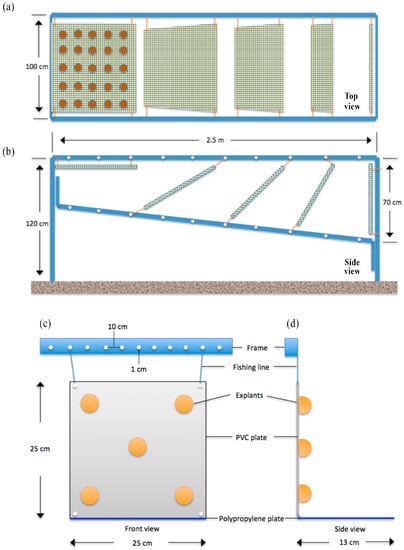 Schematic drawings of the culture platform designs. (a) 2nd trial—Top view; aluminum culture frame and attached 50 × 50 cm polyvinyl chloride (PVC) plates covered with chicken wire, each carrying 25 sponge explants on one side, totaling 50 sponges per plate. (b) 2nd trial—Side view; plates positioned at 9 different testing angles 0°, 30°, 45°, 60°, 90°, 120°, 135°, 150°, 180°. 3rd trial, (c) 3rd trial—front view, and (d) 3rd trial—side view showing positioning of glued C. reniformis explants on 25 × 25 cm PVC plates. PVC plates were secured tightly to the aluminum frame from four corners with 6-mm thick fishing lines, blue PP plates were attached to the bottom sides of the PVC plates.