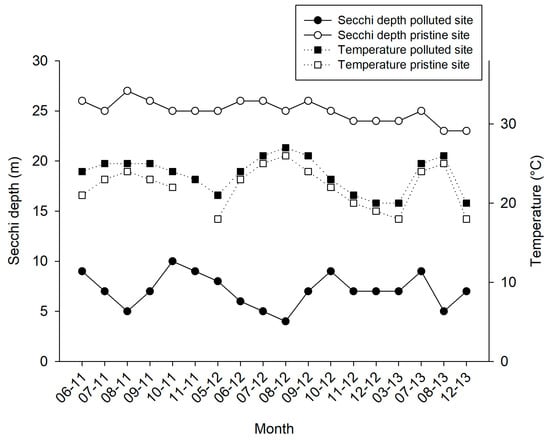 Visibility was on average 3.8 times lower at the polluted site (6.5 ± 1.7 m; mean ± SD throughout text unless stated otherwise) when compared with pristine site (25 ± 1.1 m; Figure 3). The water temperatures that were recorded at the polluted site ranged between 19–26 °C (Figure 3). During summer periods, especially in August, as a result of intensive fish feeding activities, Secchi disk water depth dropped to 4–6 m at the polluted site (Figure 3). TOC levels at the polluted site (280 ± 0.07 µmol L−1) were 2.4 times higher than the TOC levels at the pristine site (110 ± 0.01 µmol L−1).
