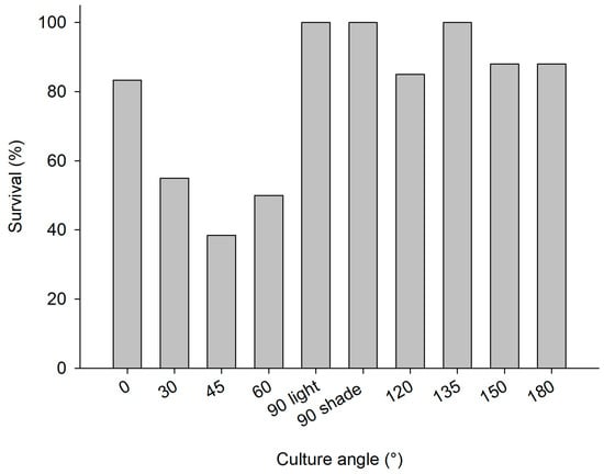 Culture angle directly affected explant survival, mainly in association with prevailing light levels. Lower light levels at the more turbid polluted site may, therefore, also explain the higher explant survival at the light-exposed angles at the polluted site. These results corroborate the findings of [35], which purport C. reniformis prefers shaded habitats.