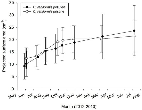 During the first week of the experiment, 69 (polluted) and 70 (pristine) out of 200 explants dropped off the PVC plates. Fortunately, the PP plates that were placed under the PVC plates were able to catch 55 (at polluted site) and nine (at pristine site) of these explants, which attached onto the PP plates and continued to increase their surface area. Because they could not be related anymore to their original size, explants that were attached on the PP plates were left out of the surface area increase analysis. However, they were included in calculation of survival rates, which were highly different between the pristine and polluted sites (39–86%, respectively—Table 1 (c)). A total of 61 explants survived on the vertical PVC plates (30 explants on 15 plates at the pristine site, 31 explants on 16 plates at the polluted site), which were used for surface area increase analysis. The average increase in surface area over time of these C. reniformis explants is presented in Figure 6. After being cultured for 13 months, the average surface area increase was 79.0 ± 37.4% at the pristine site and 170.4 ± 109.1% at the polluted site (Table 1 (c)). Both culture site and time had a significant main effect on sponge surface area increase rates (Table 2). At both sites, explant surface area increased significantly, but it slowed down after the first six months at both sites (two-way factorial ANOVA, F1,27 = 55.550; p < 0.001), and for the pristine site even stalled after six months. Surface increase was significantly higher at the polluted site as compared to the pristine site (two-way factorial ANOVA, F1,27 = 14.439; p = 0.001), irrespective of time.