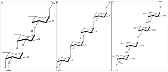 The backbone structure of fucoidan (simplified). (A): Structure of type 1 fucoidan molecules with a backbone of (1 → 3)-linked α-l-fucopyranose residues. The ‘R’ can be a monosaccharide or a sulfate group. (B): Structure of type 2 fucoidan molecules with a backbone alternating (1 → 3)-linked α-l-fucopyranose and (1 → 4)-linked α-l-fucopyranose residues. The ‘R’ can be a monosaccharide or a sulfate group (C): Structure of fucoidan from F. vesiculosus, with a backbone of alternating (1 → 3)-linked α-l-fucopyranose and (1 → 4)-linked α-l-fucopyranose residues and the presence of sulfate groups on both O-2 and O-3 [21,22,30]. R = uronic acid/rhamnose/glucose/galactose/xylose/mannose/arabinose/ribose/glucuronic acid (common found monosaccharides in fucoidan) [31,32,33,34,35,36,37,38,39,40].