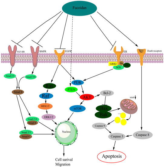 The MAPK and the PI3K/AKT pathways are the main pathways affected by fucoidan. Besides, the importance of the fucoidan-induced regulation of cellular organization, the receptor interaction also draws attention. The importance of receptor expression has been recognized in cancer research. Nowadays, there are multiple drugs that are targeting the receptors and consequently the underlying cellular mechanism [146,147,148]. Fucoidan is able to inhibit the expression of different proteins and receptors in cancer cells as shown in the following section.