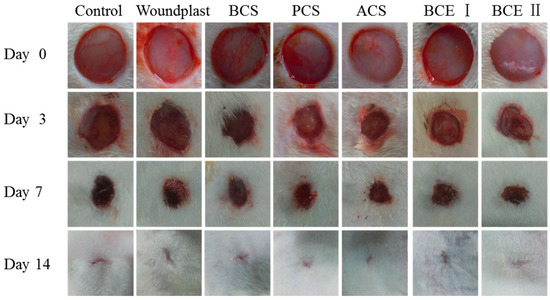 The wound healing experiment was performed as follows: female rats (body weight 200–250 g) were maintained in a pathogen free environment and fed a standard diet. 63 rats were injected intraperitoneal with sodium pentobarbital. Two full-thickness wounds of size 1 cm in diameter were created on the dorsum of SD rats which were 1.5 cm apart from the spine. These wounds were covered with medical gauze, woundplast, BCS, PCS, ACS, BCE I, and BCE II (n = 6) to avoid infections. Control group was served without any treatment (only medical gauze). Medical adhesive tape was used to attach the dressings in the wounds. Dressing change was done every two days and rats were kept in individual cages. On days 3, 7, and 14 after surgery, the morphology of the wounds was examined. The skin wounds of animals were photographed and subsequently, the rats were euthanized. Wound tissues were removed by sacrificing three rats each from all groups periodically on the 3rd, 7th, and 14th days of post wound creation and the granulation tissues formed were collected.