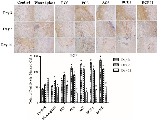 Immunohistochemical analysis of EGF expression in wounded tissues (Magnification, ×100); the histogram shows the total of positively stained cells of EGF in the dermal tissue per group. (Each bar represents the mean ± SD. * p < 0.05: significantly different from the control group.).