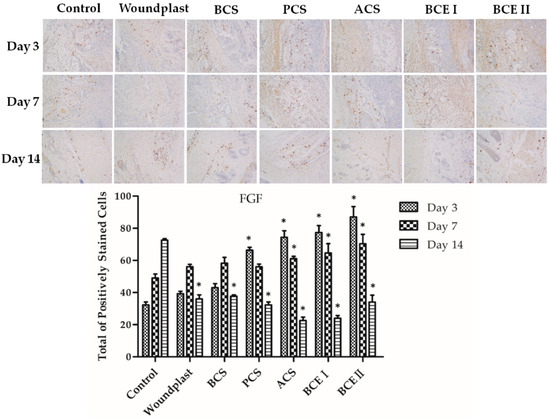 Immunohistochemical analysis of fibroblast growth factor (FGF) expression in wounded tissues (Magnification, ×100); the histogram shows the total of positively stained cells of FGF in the dermal tissue per group. (Each bar represents the mean ± SD * p < 0.05: significantly different from the control group.