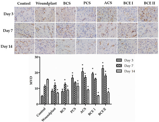 Immunohistochemical analysis of CD31 expression in wounded tissues (Magnification, ×200). The histogram summarizes the microvessel density (MVD), which was determined by immunohistochemical staining for CD31. (Each bar represents the mean ± SD. * p < 0.05: significantly different from the control group.).
